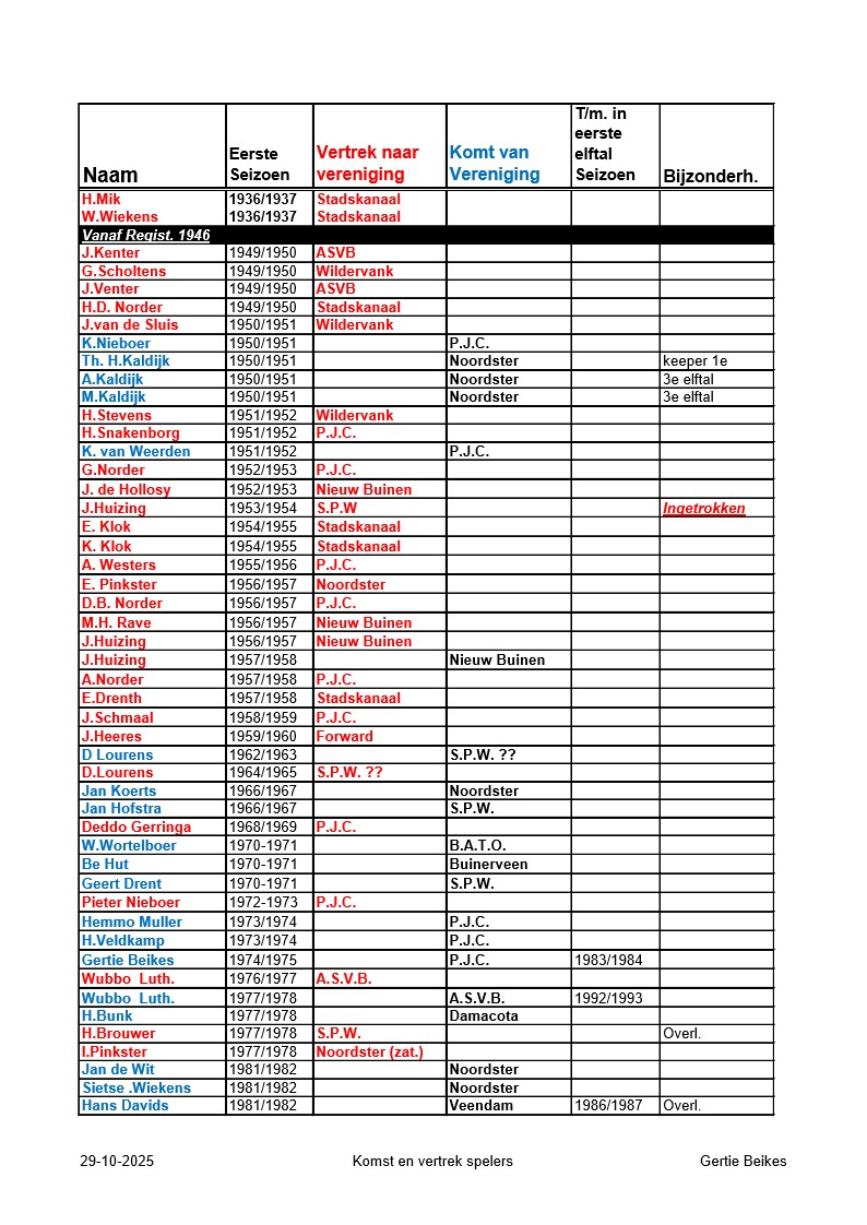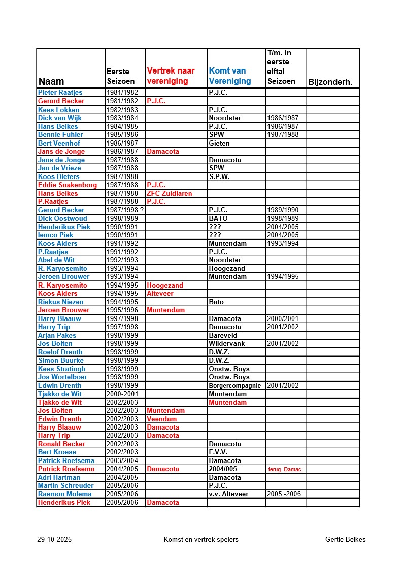 Pek. Boys Komst en vertrek spelers Gertie Beikes