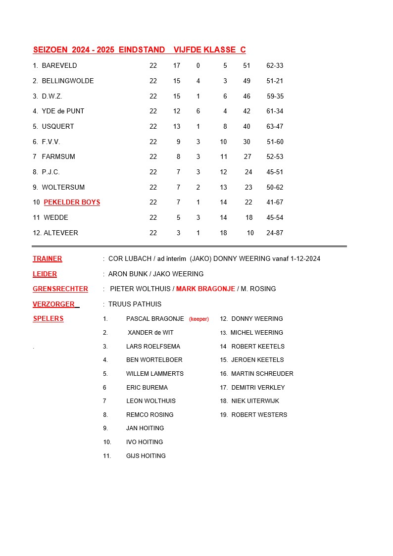 Pek. Boys Uitslagen en Eindstanden vanaf 1946 tm 2025